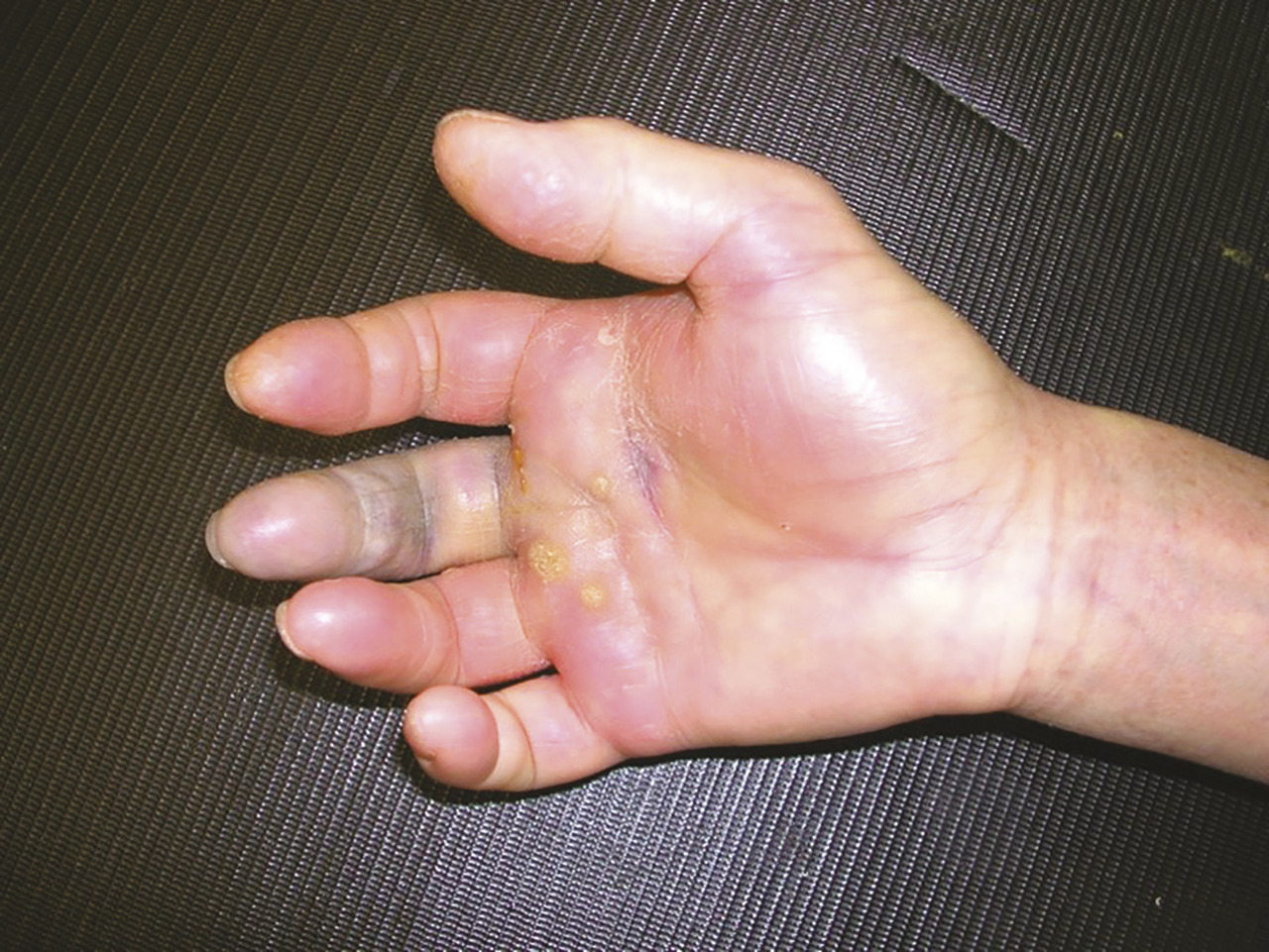 Il s’agit d’une infection de la gaine des tendons fléchisseurs des doigts, par une atteinte initiale préférentielle du tissu synovial. Ici au stade 3, les tendons fléchisseurs sont atteints sévèrement, parfois nécrosés. La mobilisation du doigt est impossible. Le traitement chirurgical d’emblée est urgent.