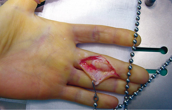 © Yannick Pinoit, Éric Senneville, Henri Migaud (Le Revue du Praticien) Chirurgie d'un phlegmon des gaines des fléchisseurs. Tiré de : Pinoit Y, Senneville É, Migaud H, Infection aiguë des parties molles, Rev Prat 2010;5.