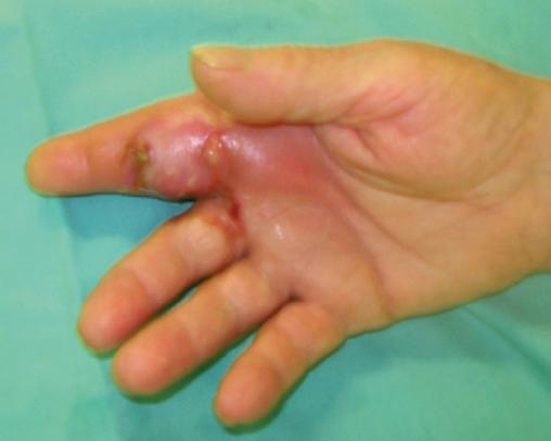 Aspect de phlegmon des gaines évolué avec fistulisation à la peau. Tiré de : Bouiller K, Menu G, Menez C, Chirouze C. Infection aiguë des parties molles. Rev Prat 2018;68(3):e181-8.