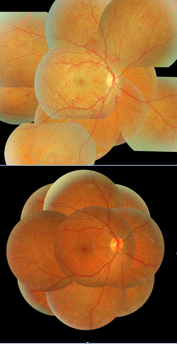 La photocoagulation panrétinienne reste le principal traitement de la rétinopathie diabétique proliférante.(En haut) Rétinopathie diabétique proliférante avec larges plages de néovaisseaux prérétiniens.(En bas) Disparition des néovaisseaux après réalisation de la photocoagulation panrétinienne.