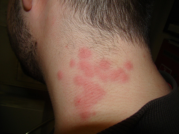 Les lésions, très prurigineuses ont l’aspect de macules érythémateuses ou papules oedémateuses centrées par une vésicule ou une croûte au point de morsure, survenant quelques heures à plusieurs jours après la piqûre, persistant quelques jours, souventregroupées par 3 ou plus ou disposées de façon linéaire. Parfois, elles sont profuses, mimant une urticaire.