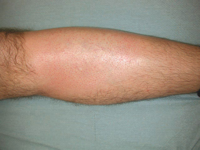 ©Vincent Descamps - La Revue du Praticien Plaque de pelade de la jambe. La pelade peut toucher le système pileux hors cuir chevelu.