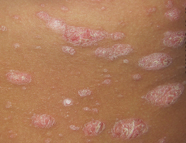 ©La Revue du Praticien Plaque typique de psoriasis : érythème squameux, bien limité, à squames épaisses