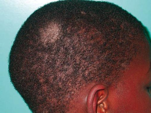 ©Vincent Descamps - La Revue du Praticien Les plaques alopéciques sont dues à la cassure plus ou moins haute de groupes de cheveux détruits par les dermatophytes kératinophiles