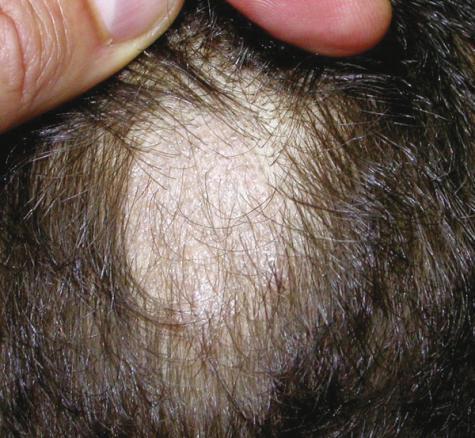 ©Pierre Assouly - La Revue du Praticien Les teignes du cuir chevelu sont très fréquentes chez les jeunes enfants. Les pathogènes responsables sont des dermatophytes qui provoquent une alopécie et une desquamation du sommet du crâne.