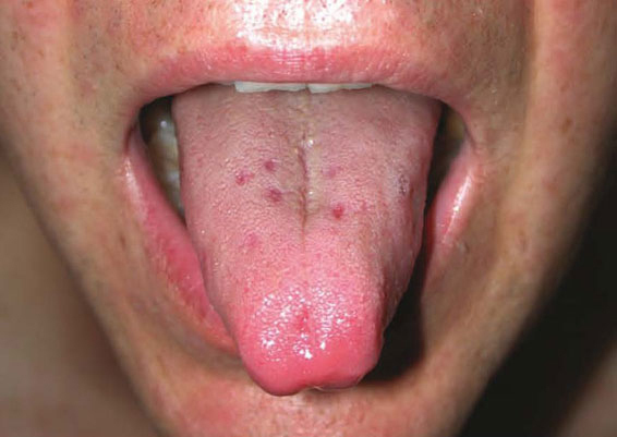 L’examen de la cavité buccale de cet homme montre des petites zones dépapillées de la langue correspondant aux « plaques fauchées » de la syphilis secondaire. L’examen au miscroscope à fond noir n’est d’aucune utilité dans ce cas, car il peut être faussement positif du fait de la présence de spirochètes saprophytes dans la cavité buccale. Chez ce patient, les 2 tests sérologiques (TPHA et VDRL) se sont avérés fortement positifs conduisant à un traitement par Extencilline. Sur le plan biologique, il existe aussi une discrète cytolyse hépatique, assez fréquente au cours de la syphilis (coll. N. Dupin).