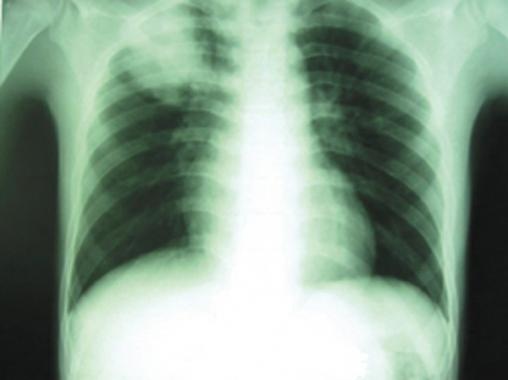 ©La Revue du Praticien Radiographie de thorax de face. Condensation alvéolaire du lobe supérieur droit due à une pneumonie à pneumocoque.