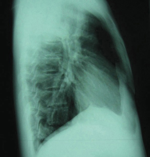 ©La Revue du Praticien Radiographie de thorax de profil. Condensation alvéolaire du lobe supérieur droit due à une pneumonie à pneumocoque.