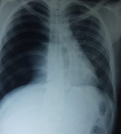 Radiographie thoracique de face avec une hyperclarté homogène, sans trame vasculaire, limitée en dedans par le moignon pulmonaire.