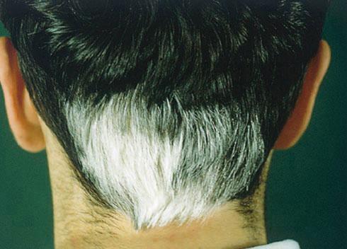 ©Edouard Grosshans - La Revue du Praticien Pelade occipitale avec phénomène de repousse de cheveux blancs (poliose peladique).