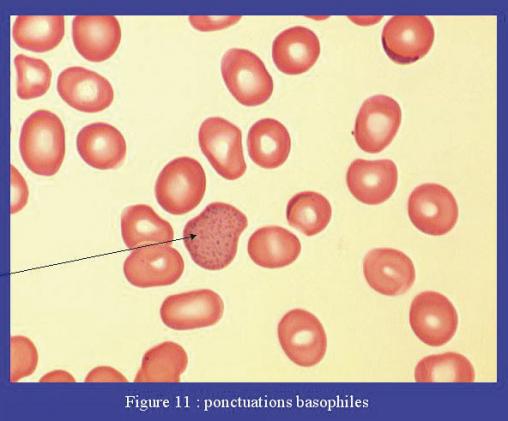 Les ponctuations basophiles sont les plus fréquentes. Elles sont formées d’agrégats de ribosomes et de polyribosomes. Ce sont de nombreuses granulations ressortant en bleu à la coloration de May-Grünwald-Giemsa, réparties uniformément dans l’ensemble du cytoplasme du globule rouge. On parle d’hématies ponctuées. Ces ponctuations basophiles se rencontrent dans les dysérythropoïèses congénitales ou acquises, les déficits en 5’pyrimidine-nucléotidase constitutionnels et acquis (intoxication au plomb), les anémies chroniques régénératives.