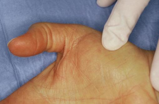 © Daniel Tordjman, Jérôme Pierrart, Emmanuel Masmejean (La Revue du Praticien) Vue préopératoire. Voir : Tordjman D, Pierrart J, Masmejean E. Le doigt à ressaut. Rev Prat 2013;63:1268-70.