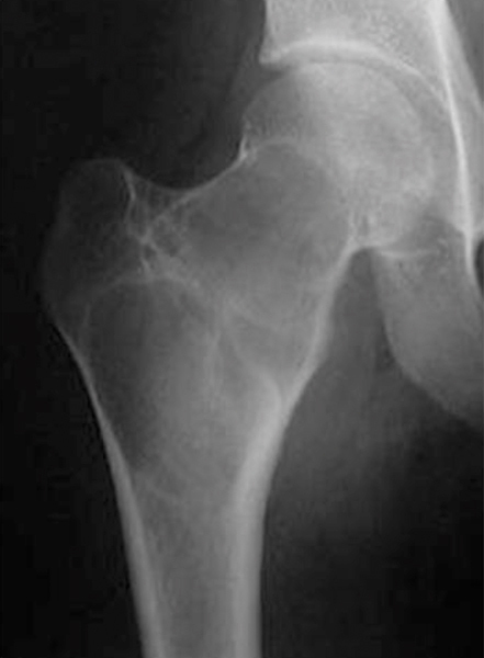 La lyse est cernée d'une sclérose périphérique régulière. Elle contient quelques travées qui sont régulières et respectées. L'ensemble dessinant un "contour géographique". Les corticales sont discrètement déformées et amincies, mais également de façon régulière, sans effraction. Il n'y a pas de réaction périostée. Il n'y a pas d'expansion apparente dans les parties molles. Cet aspect radiologique est calme, traduisant plutôt une tumeur bénigne. Ce processus est lent. Il reste donc régulier, souvent cerné d'une bande de sclérose qui est une construction réactionnelle de l'organisation, mais qui dans ce cas est bien limitée et respectée.