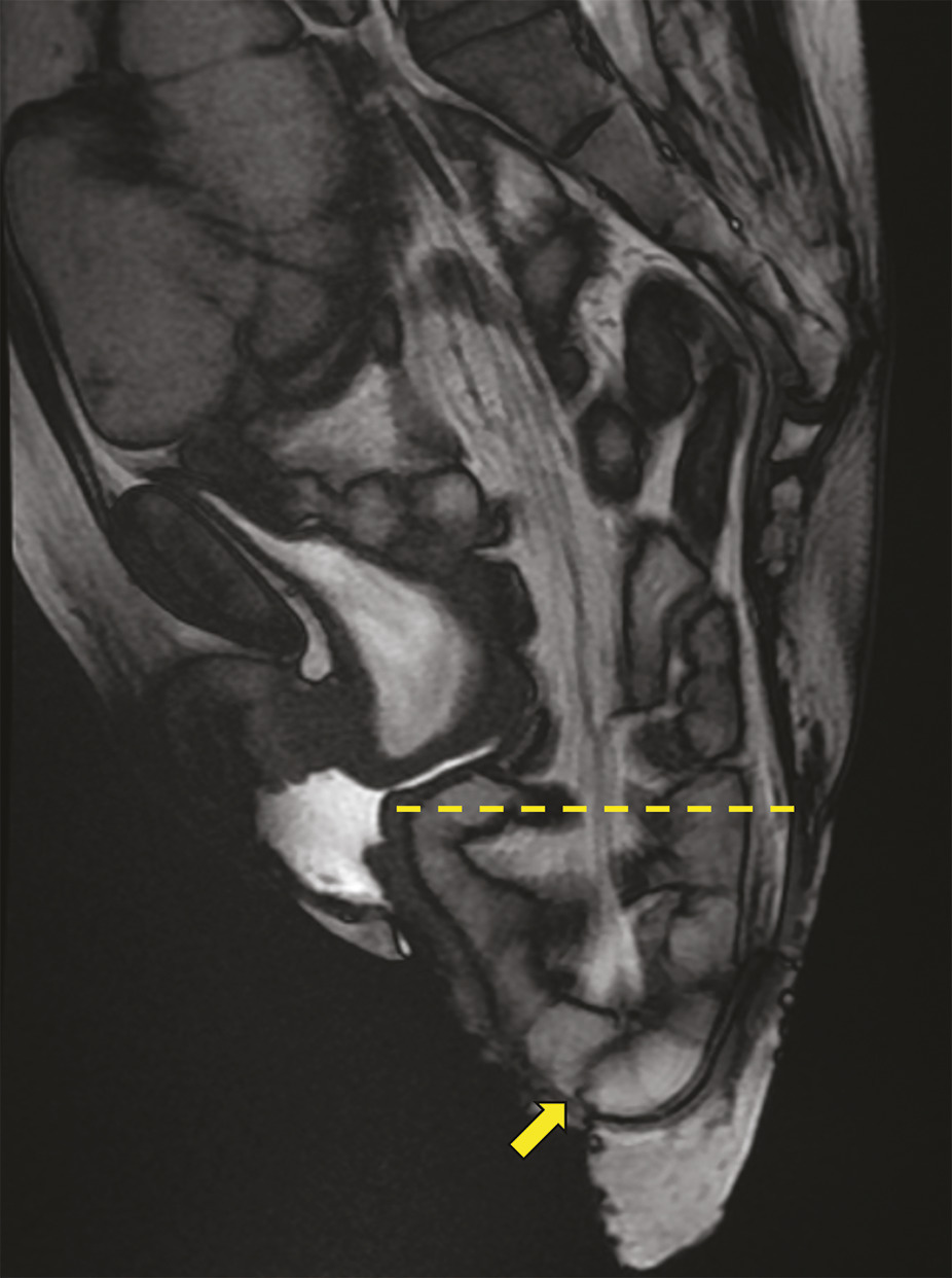 IRM. Séquence dynamique en poussée maximale montrant un volumineux prolapsus rectal externe associé à une entérocèle (descente des anses grêles) trans-recto-anale (flèche).