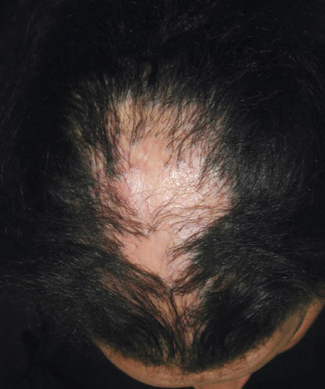 ©Vincent Descamps - La Revue du Praticien Le diagnostic étiologique est souvent difficile et repose sur l’analyse des zones inflammatoires actives en périphérie de l’alopécie ainsi que sur un examen dermatologique et général complet.