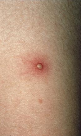 Lésion pustuleuse non centrée par un follicule pileux.