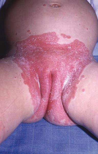 L’aspect clinique de ces lésions, qui ont des caractéristiques très proches de celui du psoriasis de l’adulte, érythème sec, rouge vif ou foncé, bien limité, est tout à fait évocateur du psoriasis de l’aire des langes souvent désigné sous sa dénomination en langue anglaise de napkin psoriasis.