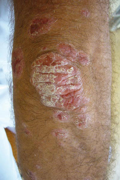 ©La Revue du Praticien Macules érythémateuses, arrondies, recouvertes de squames siégeant au niveau du coude caractéristiques d'un psoriasis.