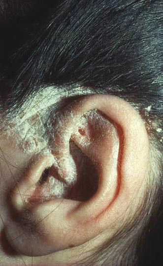 Au niveau du cuir chevelu, les squames sont denses et on ne voit l’érythème qu’au niveau de l’oreille. Les cheveux traversent verticalement ces squames très sèches qui ne sont pas mobilisées à la traction des cheveux. Ces squames sont assez adhérentes, mais quelques-unes se détachent dans la région rétro-auriculaire. Au niveau de l’oreille, les squames recouvrent presque complètement l’érythème. Les lésions sont parfois prurigineuses dans cette localisation, et l’on voit en effet une croûtelle.