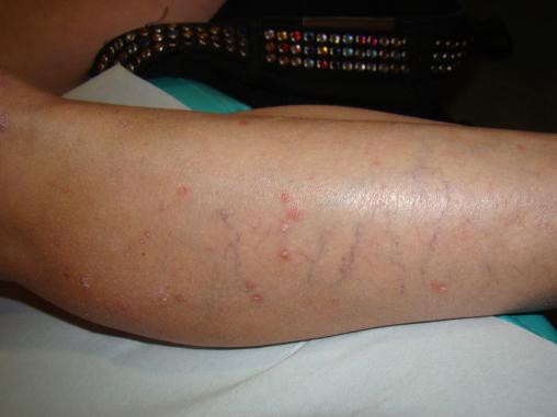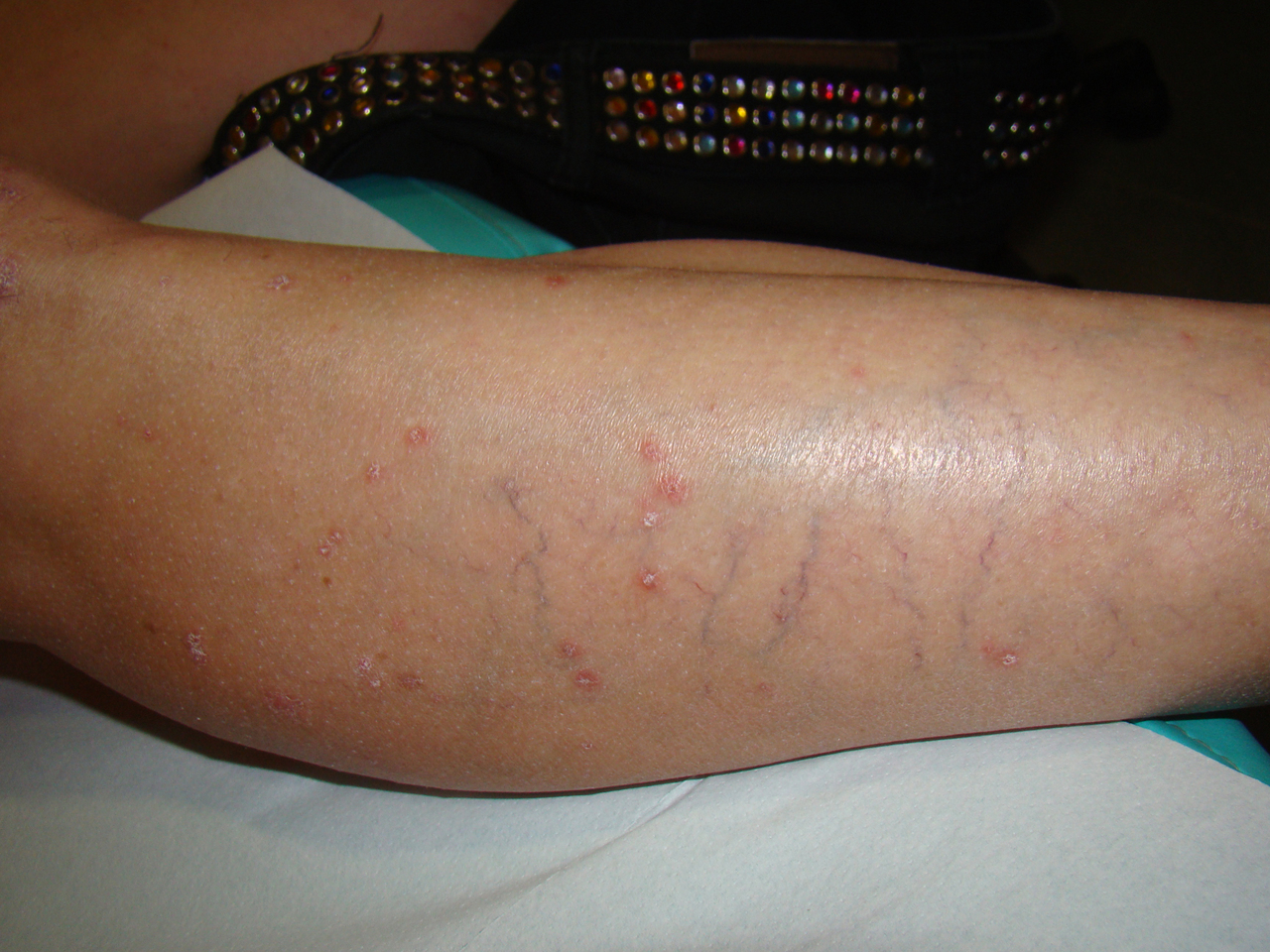 Collection P. Frances Petites lésions papulo-nodulaires au niveau des cuisses. Les lésions, blancheset hyperkératosiques (ressemblant à des taches de cire), ont des bords érythémateux bien limités.