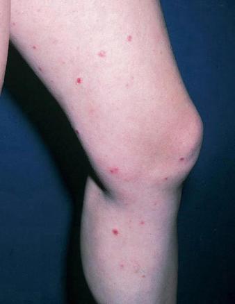 Lésions de psoriasis en gouttes du membre inférieur. Volontiers observée chez les enfants après un épisode infectieux ORL ou chez l’adulte jeune, cette forme clinique aiguë est faite de nombreuses lésions érythémateuses plus ou moins squameuses de petite taille, punctiformes ou lenticulaires disséminées à l’ensemble du corps. La responsabilité d’infections streptococciques a été suggérée dans le déclenchement de cette forme de psoriasis.