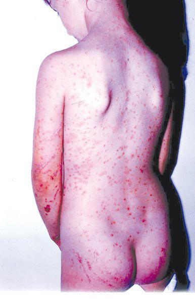 ©La Revue du Praticien Psoriasis en gouttes avec signe de Köbner au niveau d’un bras et d’une fesse. L’aspect clinique des lésions est tout à fait caractéristique du psoriasis, malgré leur caractère peu squameux, habituel dans cette forme de l’enfant