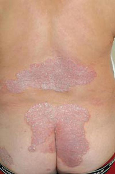 ©La Revue du Praticien L’atteinte de la région lombo-sacrée est une forme topographique caractéristique du psoriasis.