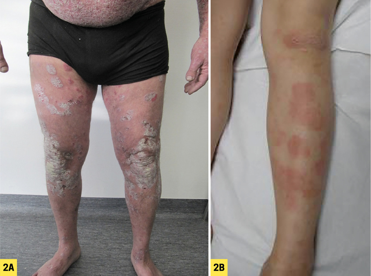 A. Forme sévère de l’adulte. Noter l’aspect typique de la lésion élémentaire et la distribution : relative symétrie des lésions et atteinte des zones bastion (genoux). B. Forme eczématiforme de l’enfant