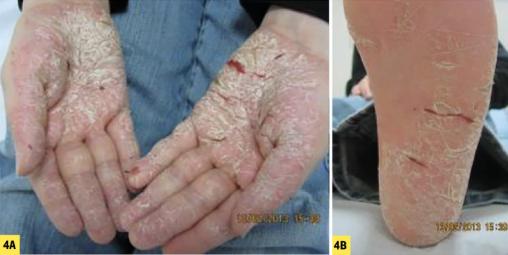 Psoriasis en plaques chez un enfant de 10 ans. Lésions fissuraires palmaires (Fig. A), plantaires (Fig. B) Extrait de : Psoriasis