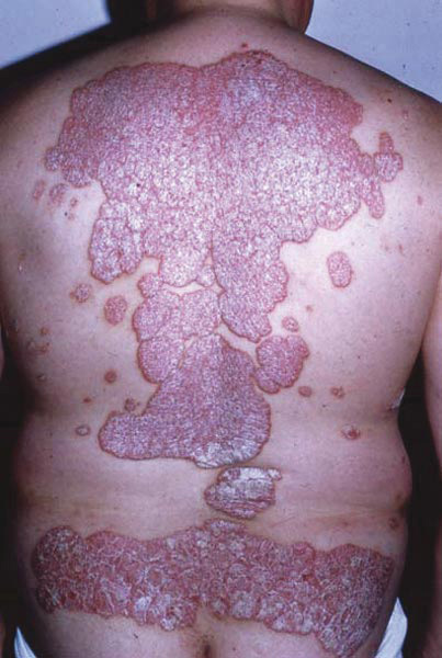 Les lésions sont rouge vif, couvertes de squames épaisses dont les plus superficielles se détachent facilement au grattage et tombent quand le patient se déshabille. L’aspect érythémato-squameux des lésions, qui définit le psoriasis vulgaire, est ici tout à fait typique.