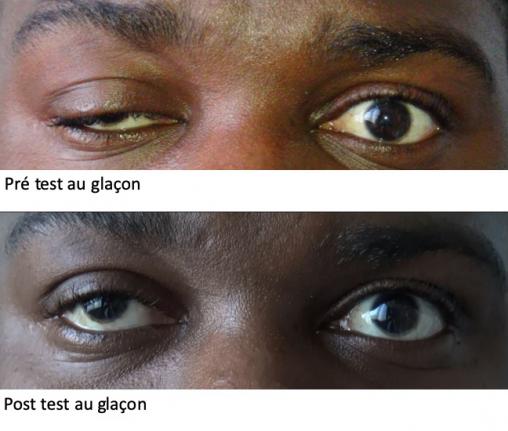 © Manon Philibert (La Revue du Praticien) Ptosis droit avant et après test au glaçon pathognomonique de la myasthénie.