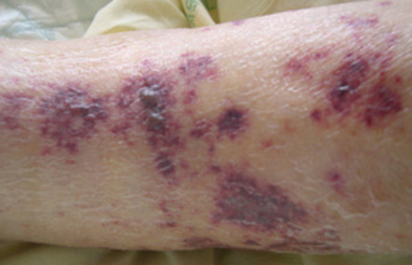 Le purpura vasculaire est lié à une fragilisation de la paroi vasculaire, il est le plus souvent infiltré (épaissi), associé à d'autres lésions cutanées (urticaire, bulles ou zones nécrotiques) et prédomine aux membres inférieurs. Il est aggravé par l'orthostatisme.