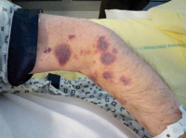 ©La Revue du Praticien Le purpura sénile de Bateman est associé à une atrophie cutanée importante chez les sujets âgés. Un aspect superposable s'observe au cours de corticothérapie au long cours à fortes doses.