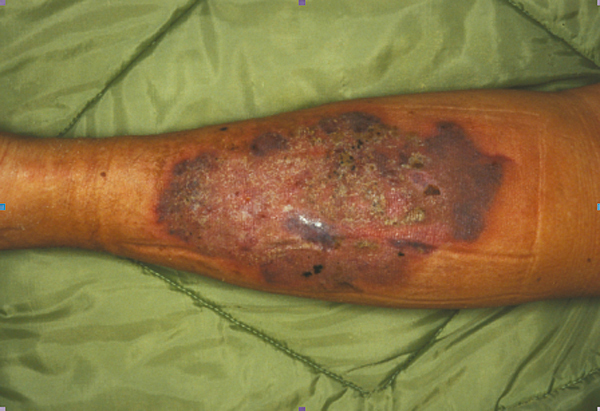 Pyoderma gangrenosum du membre inférieur au cours d'une rectocolite hémorragique.