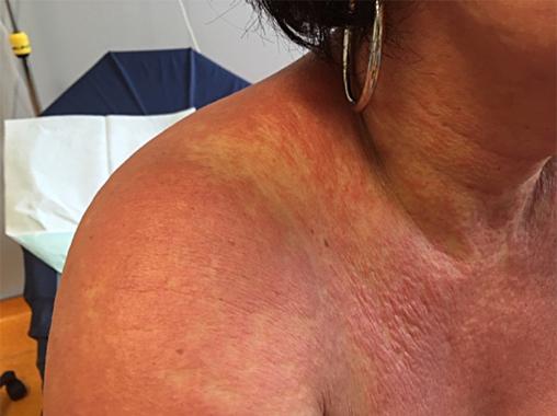 – pas d’énanthème mais atteinte muqueuse fréquente par destruction de l’épiderme (chéilites, stomatites) ;