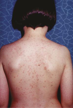 Rash d'allure urticarienne, concomitant aux épisodes inflammatoires. Il s’agit d’une éruption maculo-papuleuse, migratrice, parfois confluente.