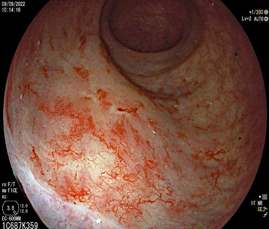 L’endoscopie révèle de multiples télangiectasies du bas rectum Extrait de : Rectite radique chronique hémorragique