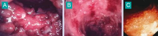 Figure A - Pseudopolyposes ulcérées. Figure B - Érythème et ulcérations superficielles. Figure C - Muqueuse granitée hémorragique.