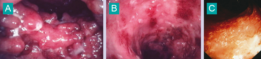 Figure A - Pseudopolyposes ulcérées. Figure B - Érythème et ulcérations superficielles. Figure C - Muqueuse granitée hémorragique.