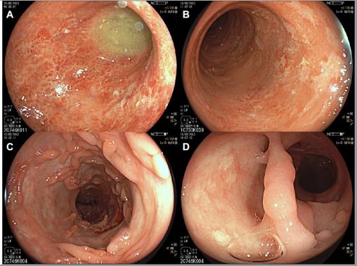 L’inflammation se caractérise par une disparition de la trame vasculaire avec une fragilité, voire un saignement de la muqueuse. Il peut y avoir des érosions (A) et/ou des ulcérations plus ou moins profondes et étendues (ulcérations superficielles sur la figure B). En cicatrisant, la muqueuse peut être le siège de pseudopolypes non inflammatoires (C) ou de ponts muqueux (D).