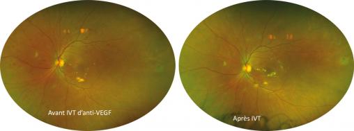 © Sophie Bonnin Rétinopathie diabétique avec de multiples hémorragies ayant régressé après injections intravitréennes d'anti-VEGF.IVT : injection intravitréenne ; VEGF : vascular endothelial growth factor. Images : Dr Sophie Bonnin.