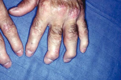 L’atteinte des articulations interphalangiennes distales est très évocatrice d’un rhumatisme psoriasique périphérique. Affirmer le diagnostic de rhumatisme psoriasique n’est pas facile s’il n’y a pas de signes cutanés évidents, et l’examen dermatologique doit être soigneux pour rechercher des lésions discrètes. L’atteinte des ongles est fréquente, mais elle peut aussi manquer comme chez ce patient.