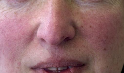 L’érythème touche les zones malaires et le nez, le centre du front et le menton, mais pas les zones péri-oculaires et péribuccales. La couleur va du rose au rouge foncé tirant sur le violet. Les télangiectasies sont situées dans les régions malaires et sur le nez ; elles s’étendent très souvent sur la joue.