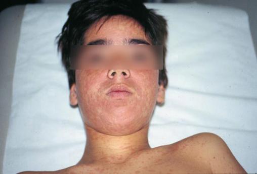Rougeole chez un adolescent. Maculo-papules rouges ménageant entre elles des intervalles de peau saine.