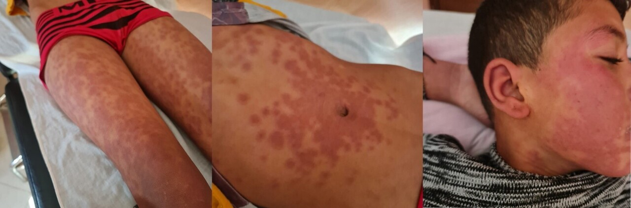 Rash « rouge brique » typique de la rougeole, accompagnée d’une toux ou d’une conjonctivite. La rougeole touche les enfants mais également les adultes non ou insuffisamment vaccinés, elle est très contagieuse (transmission par aérosols).