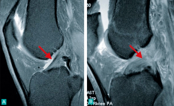 IRM coupe sagittale T2/FS. A : ligament croisé antérieur intact ; B : rupture du ligament croisé antérieur au fémur Extrait de : Item 357 - Lésions péri-articulaires et ligamentaires du genou, de la cheville et de l'épaule
