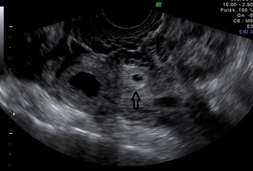 Image en cocarde (flèche) du sac gestationnel extra-utérin, proche de l’ovaire droit.