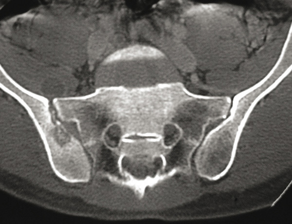 Tomodensitométrie des articulations sacroiliaques montrant une sacro-iliite tuberculeuse droite. Effacement de l'os sous-chondral, séquestres, petite collection abcédée en regard de l'interligne.