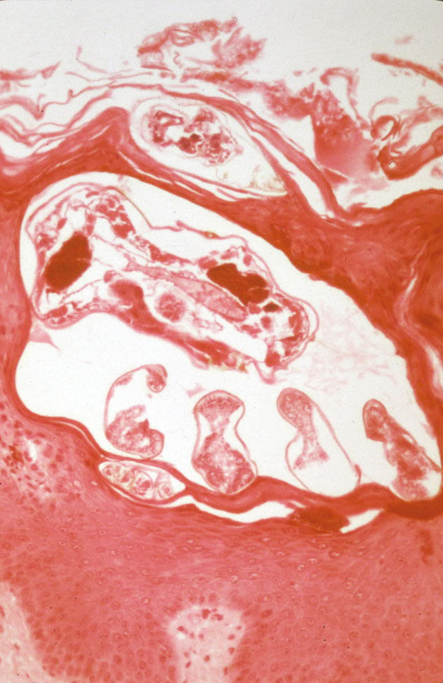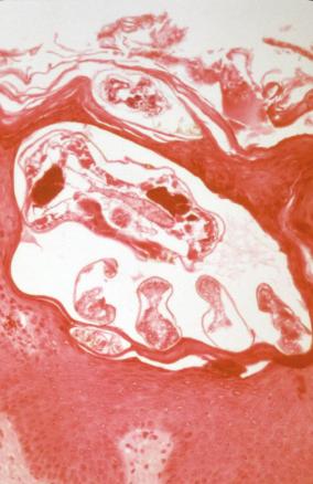©La Revue du Praticien, Christophe Bédane Sarcopte dans le stratum corneum (HES*40). Dans certains cas, l’histologie standard peut mettre en évidence le sarcopte au niveau du stratum corneum.