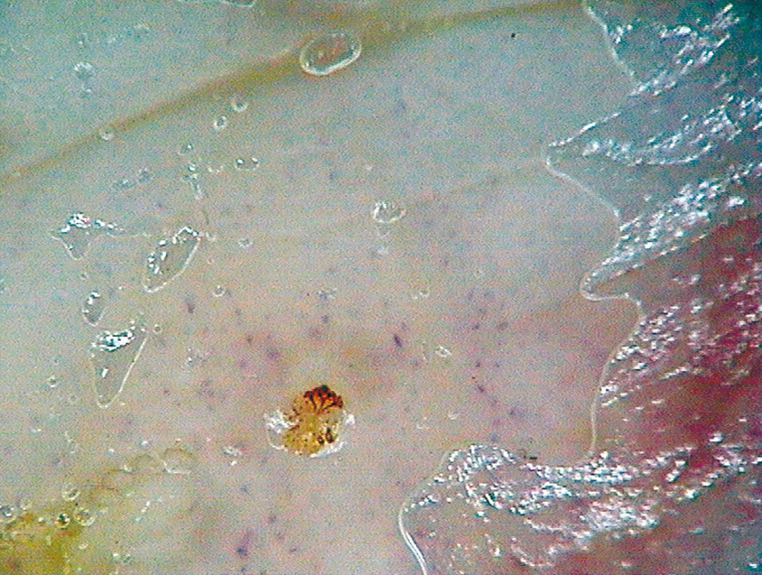 Vidéomicroscopie d’un sarcopte (x 50). Il a été proposé une méthode de repérage in vivo du sarcopte par microscope à épiluminescence permettant un diagnostic sans inconfort, car indolore pour le patient. L’utilisation du vidéomicroscope s’est d’ailleurs répandue depuis comme aide diagnostique. Il permet de repérer le sarcopte au sein de son sillon sous la forme d’un petit triangle foncé dont la base se prolonge par un segment linéaire dû à la présence de bulles d’air.